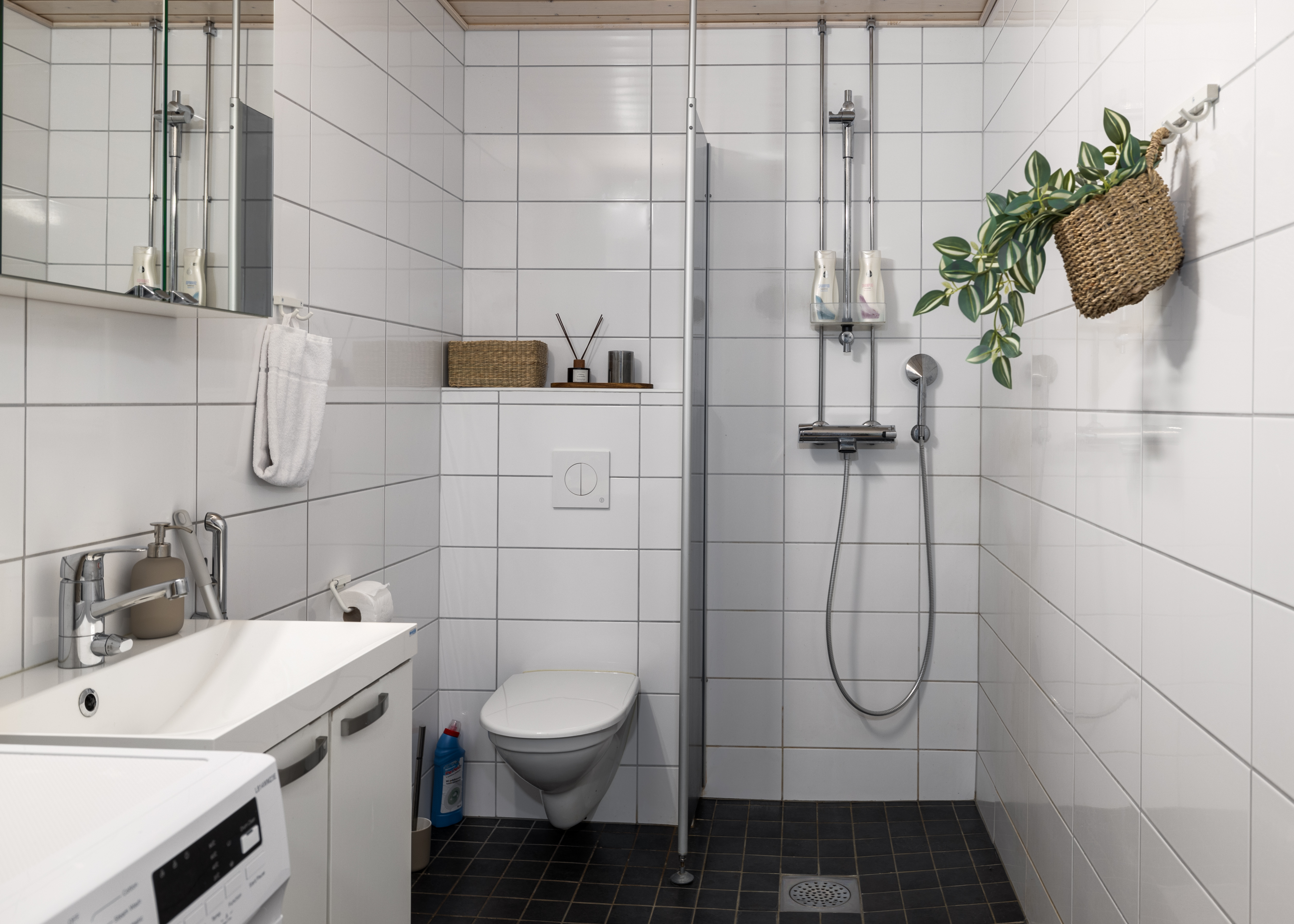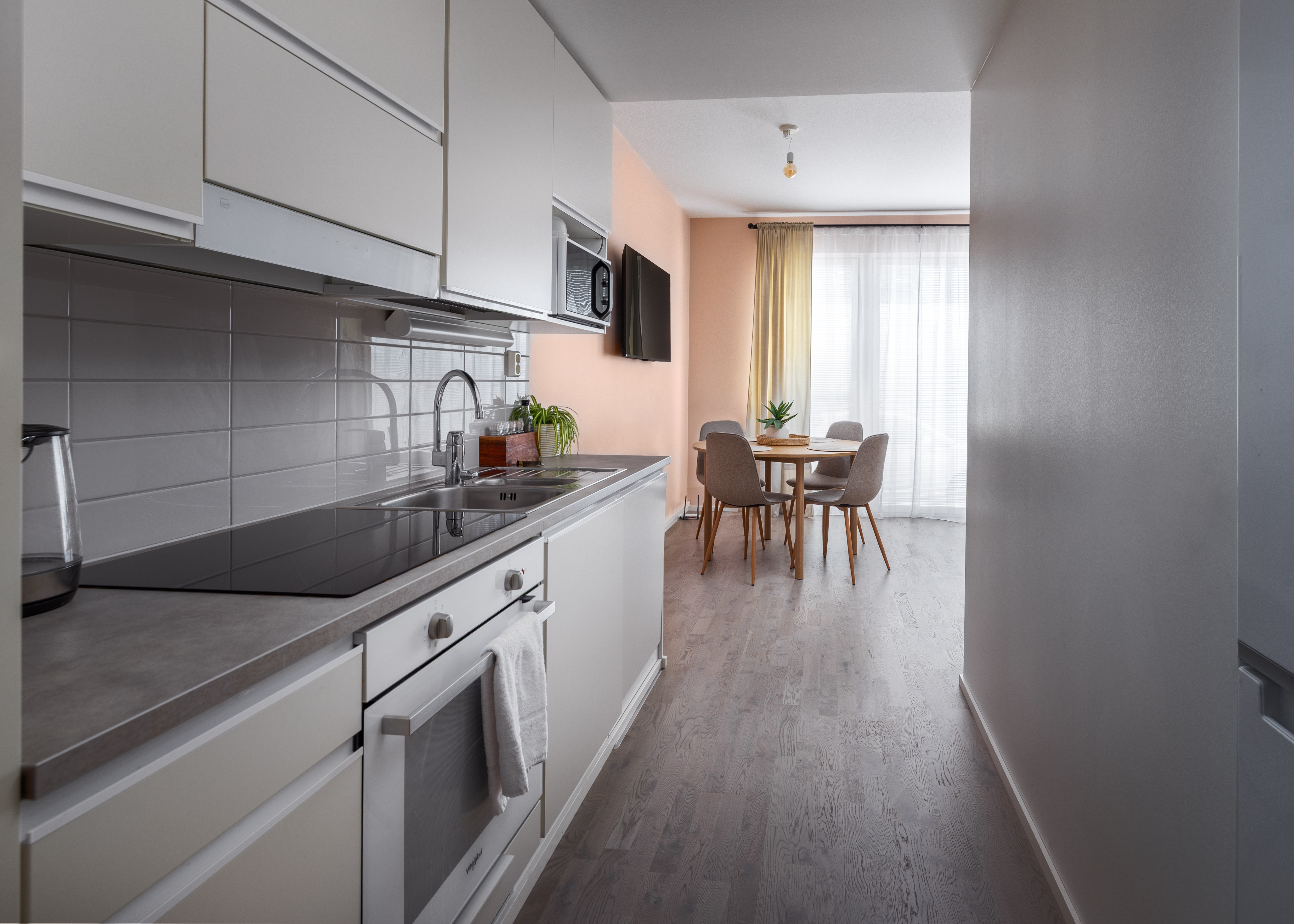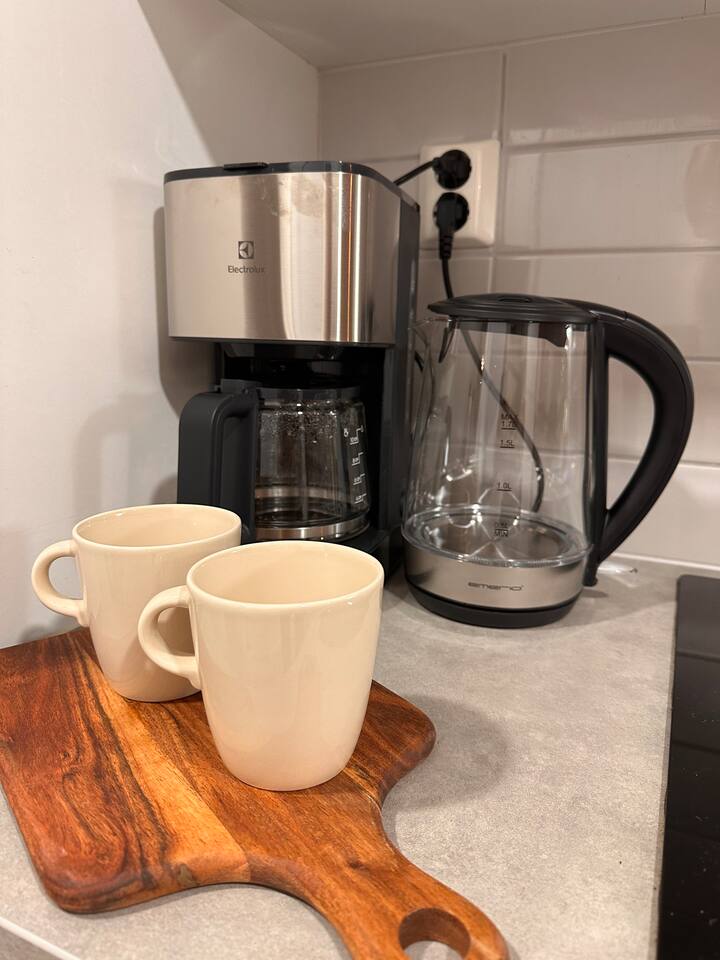 Every room in this single-level home is crafted to feel bright and welcoming, filled with natural light and local Turku-themed art. The modern, airy design creates a truly relaxing atmosphere for your stay. Living Area: Unwind after a day of sightseeing on the comfortable sofa, which easily converts to a bed for two. The space includes a dining table for four, a flat-screen TV for streaming your favorite shows, and a Bluetooth sound system for your music. Kitchen: The fully equipped kitchen is thoughtfully designed for effortless cooking. It features an induction stove, oven, integrated dishwasher, and microwave. We also provide complimentary coffee to help start your day. Bedroom: Separated by elegant sliding glass doors, the open-plan bedroom offers a luxurious queen-size bed for restful nights. Room-darkening shades ensure a deep and peaceful sleep. Bathroom: Enjoy the large, stylish bathroom, complete with a modern walk-in shower, bidet and a washing machine for your convenience. Essential toiletries like shampoo, conditioner, and body soap are provided.