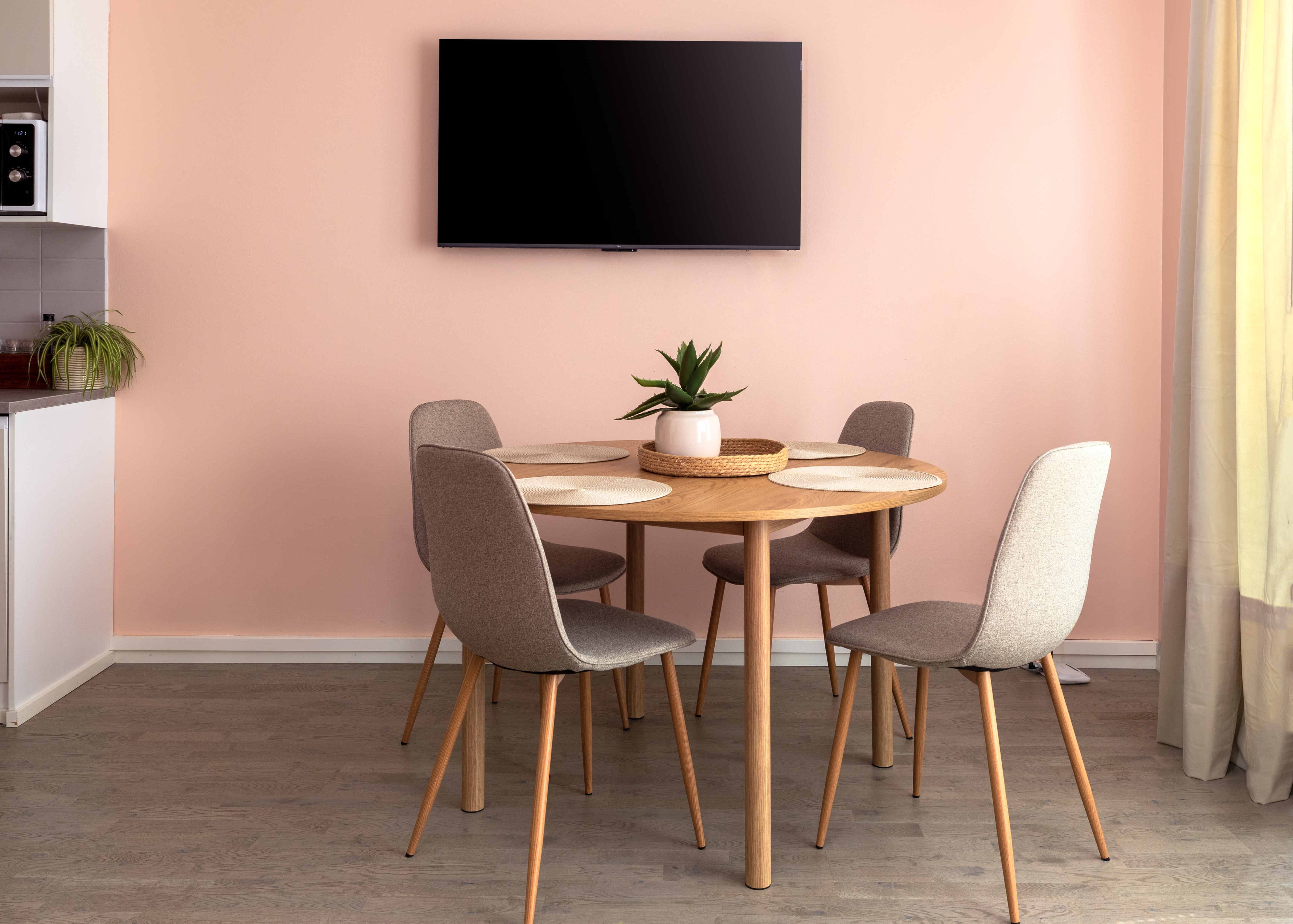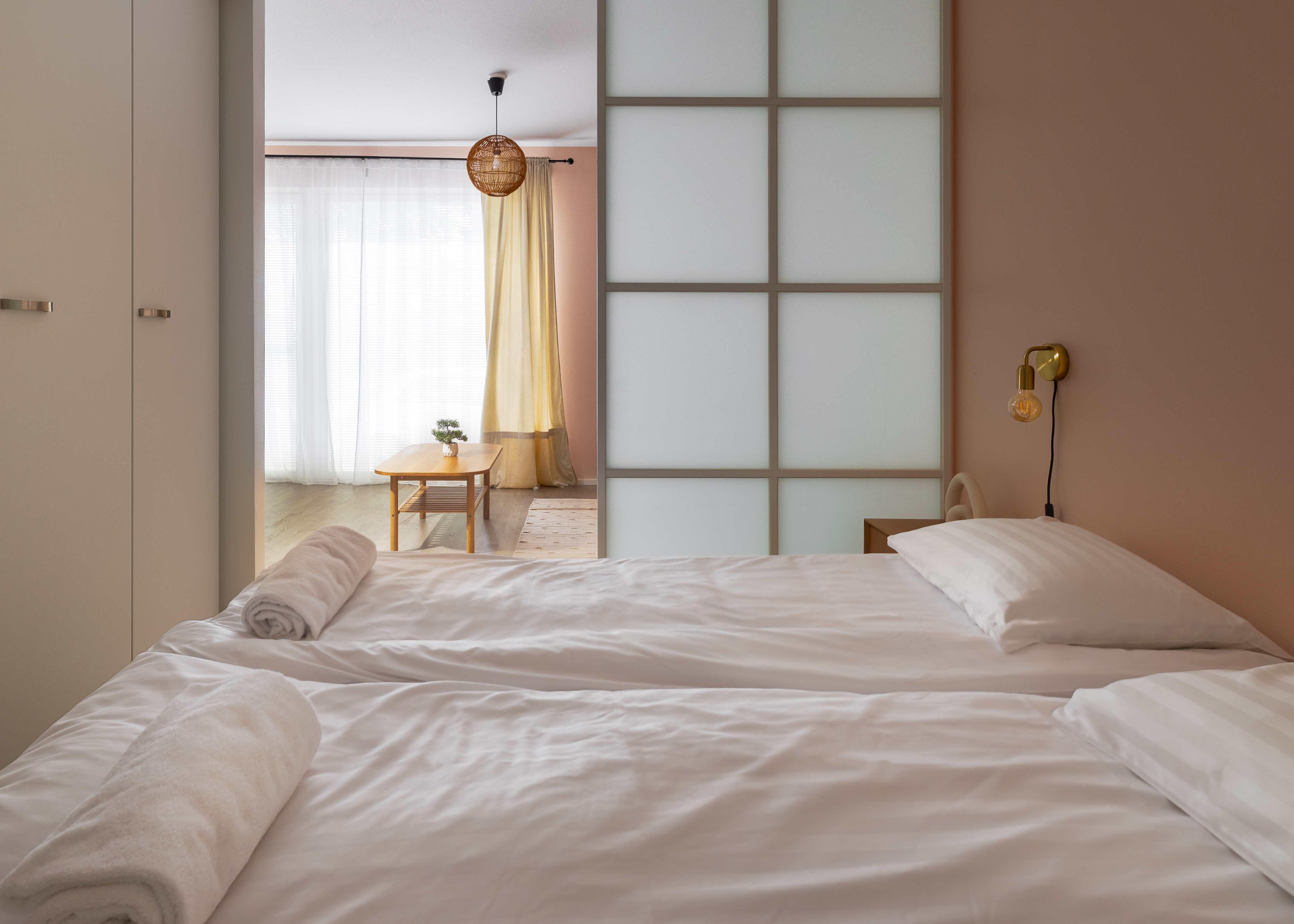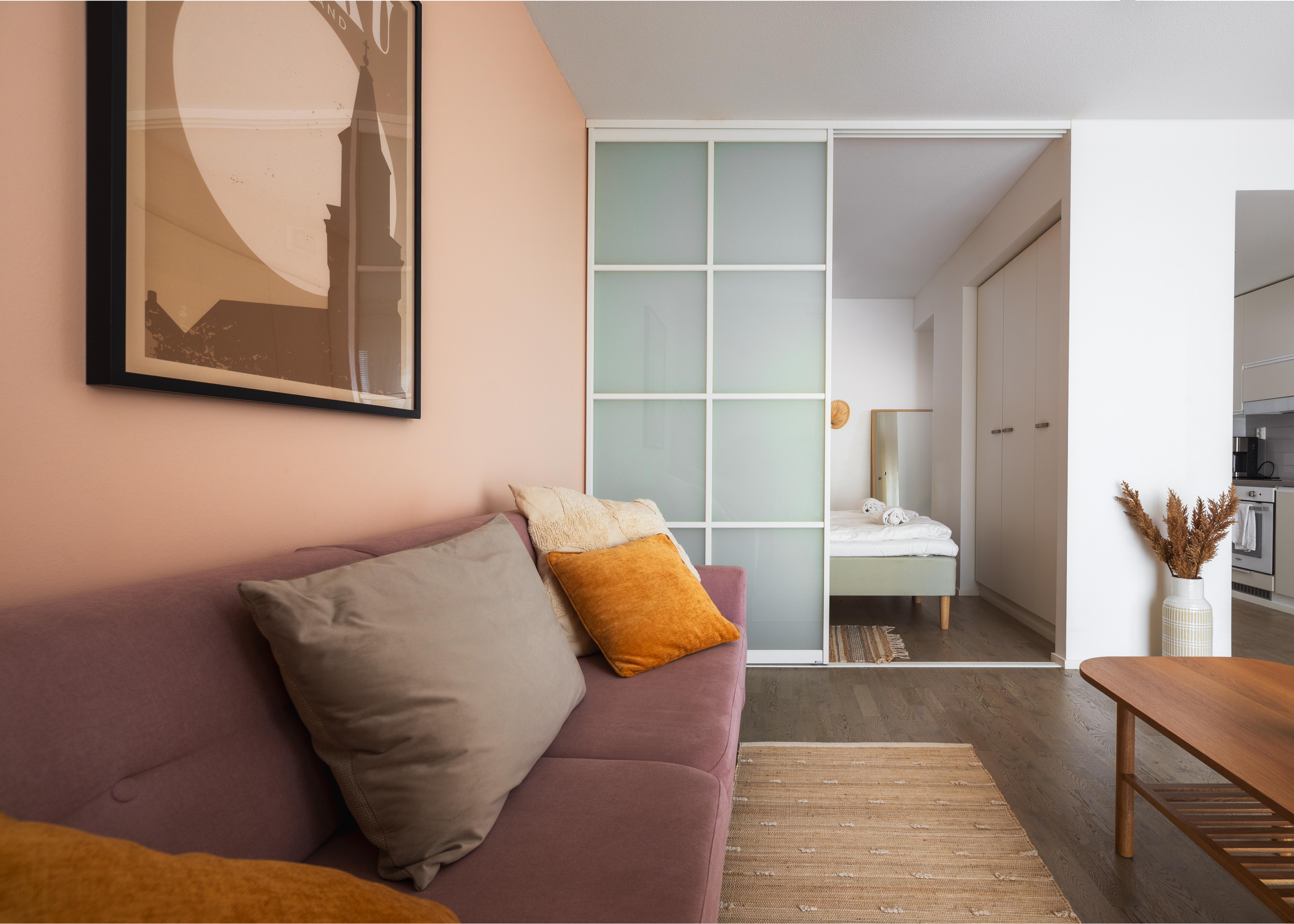 Every room in this single-level home is crafted to feel bright and welcoming, filled with natural light and local Turku-themed art. The modern, airy design creates a truly relaxing atmosphere for your stay. Living Area: Unwind after a day of sightseeing on the comfortable sofa, which easily converts to a bed for two. The space includes a dining table for four, a flat-screen TV for streaming your favorite shows, and a Bluetooth sound system for your music. Kitchen: The fully equipped kitchen is thoughtfully designed for effortless cooking. It features an induction stove, oven, integrated dishwasher, and microwave. We also provide complimentary coffee to help start your day. Bedroom: Separated by elegant sliding glass doors, the open-plan bedroom offers a luxurious queen-size bed for restful nights. Room-darkening shades ensure a deep and peaceful sleep. Bathroom: Enjoy the large, stylish bathroom, complete with a modern walk-in shower, bidet and a washing machine for your convenience. Essential toiletries like shampoo, conditioner, and body soap are provided.